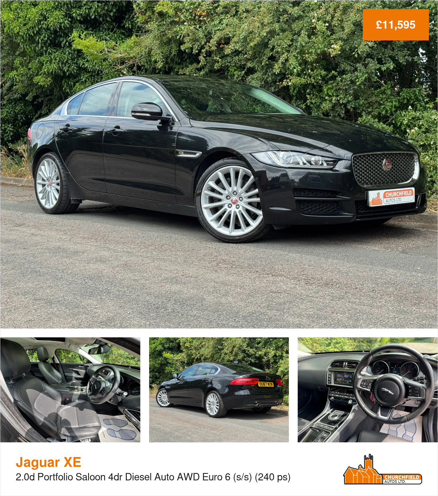 This Jaguar XE is an absolute stunner of a car! It's is supremely luxurious, incredibly comfortable, loaded with spec and has a superb 2.0 turbo diesel engine at it's heart that will whisk you anywhere you want effortlessly and efficiently! This model is the XE 2.0 Portfolio Auto to be specific and is finished in classy Santorini Black metallic paintwork and complimented by privacy glass windows and 19" Sparkling Silver alloy wheels. The inside of the car is finished in full black leather and is pleasure of a place to be when you are surrounded by comforts such as heated electric seats, heated steering wheel, electric glass sunroof, dual zone air con, sat nav, DAB radio, Bluetooth, reversing sensors, reversing camera, Meridian sound system and much more! The ride quality in this car is excellent, its engine makes for effortless overtakes and its auto gearbox is seamless. The car has been very well maintained over the years and will receive a service and fresh MOT prior to sale to ensure its new owner can enjoy many miles of hassle free motoring. If you're in the mood to treat yourself to something special, this is the car for you! All vehicles supplied by Churchfield Autos Ltd are fully mechanically inspected, history checked and come with 3 month comprehensive warranty. Flexible finance options and extended warranties are available, please ask for further information or visit our website for more information. Please contact us before coming to view to ensure we are on site and ready to help. If you have any questions or queries please do not hesitate to get in touch.