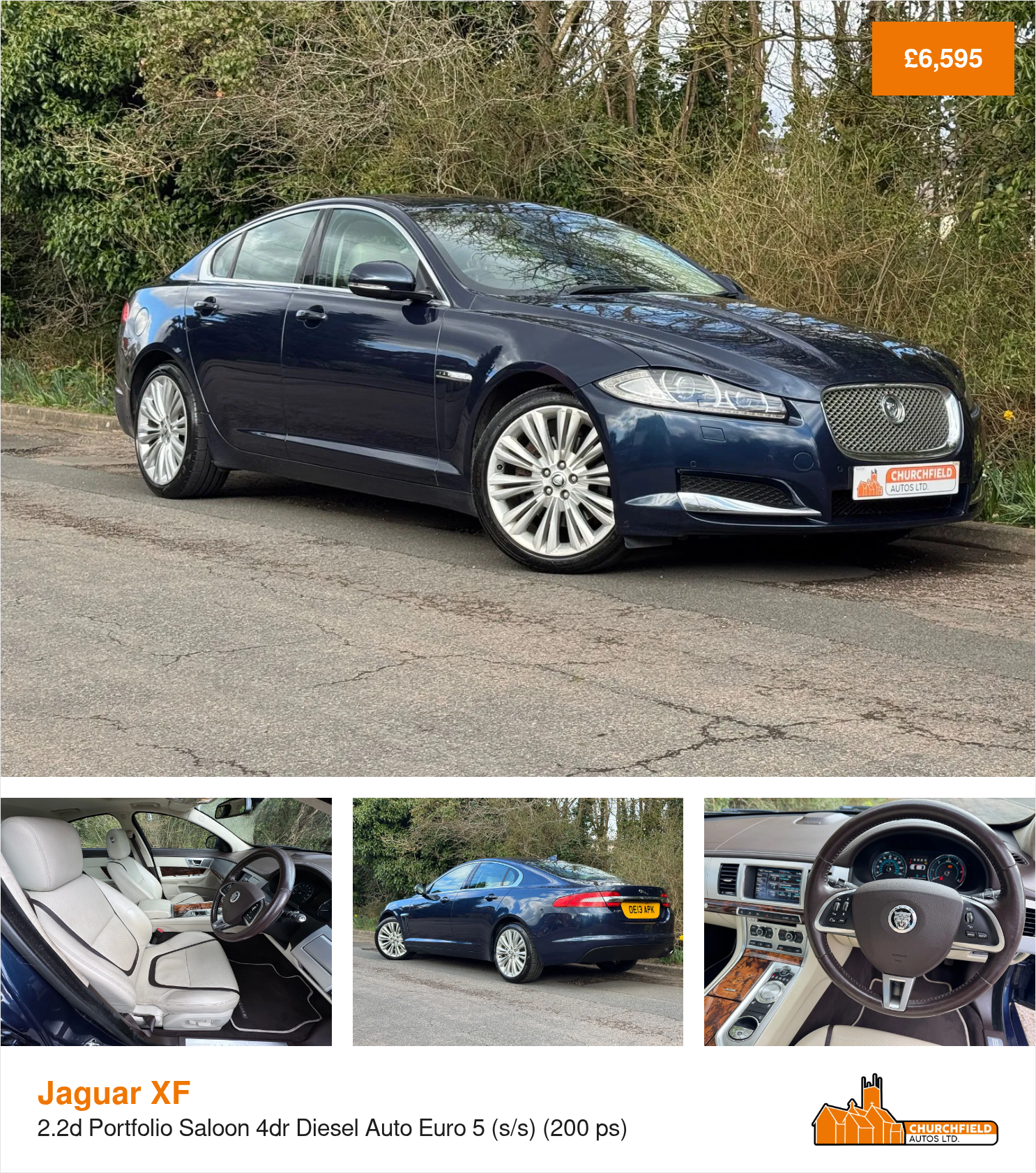 This Jaguar XF is a gorgeous car! It's is supremely luxurious, incredibly comfortable, loaded with equipment and cruises along effortlessly thanks to is punchy 2.2 turbo diesel engine! This model is the XF Portfolio Auto to be specific and is finished in a classy dark blue metallic paintwork. The inside of the car is finished in sumptuous full ivory (cream) leather with an ivory suede headlining and is pleasure of a place to be when you are surrounded by comforts such as heated electric memory seats, heated steering wheel, dual zone air con, sat nav, DAB radio, Bluetooth, reversing camera, Meridian surround sound speaker system with subwoofer and an electric glass sunroof which allows acres of light to pour through. The ride quality in this car is beautiful, its powerful engine makes for effortless overtakes and its auto gearbox is seamless. The car has been very well maintained over the years with 11 stamps in the service book and has benefitted from having a full cambelt/water pump replacement done at 83k miles - which is a significant big ticket cost taken car oof for years to come. The car has also just had a service and 12 month MOT done ready for sale. If you're in the mood for a bit of luxury, this is the car for you! All vehicles supplied by Churchfield Autos Ltd are fully mechanically inspected, history checked and come with 3 month comprehensive warranty. Flexible finance options and extended warranties are available, please ask for further information or visit our website for more information. Please contact us before coming to view to ensure we are on site and ready to help. If you have any questions or queries please do not hesitate to get in touch.