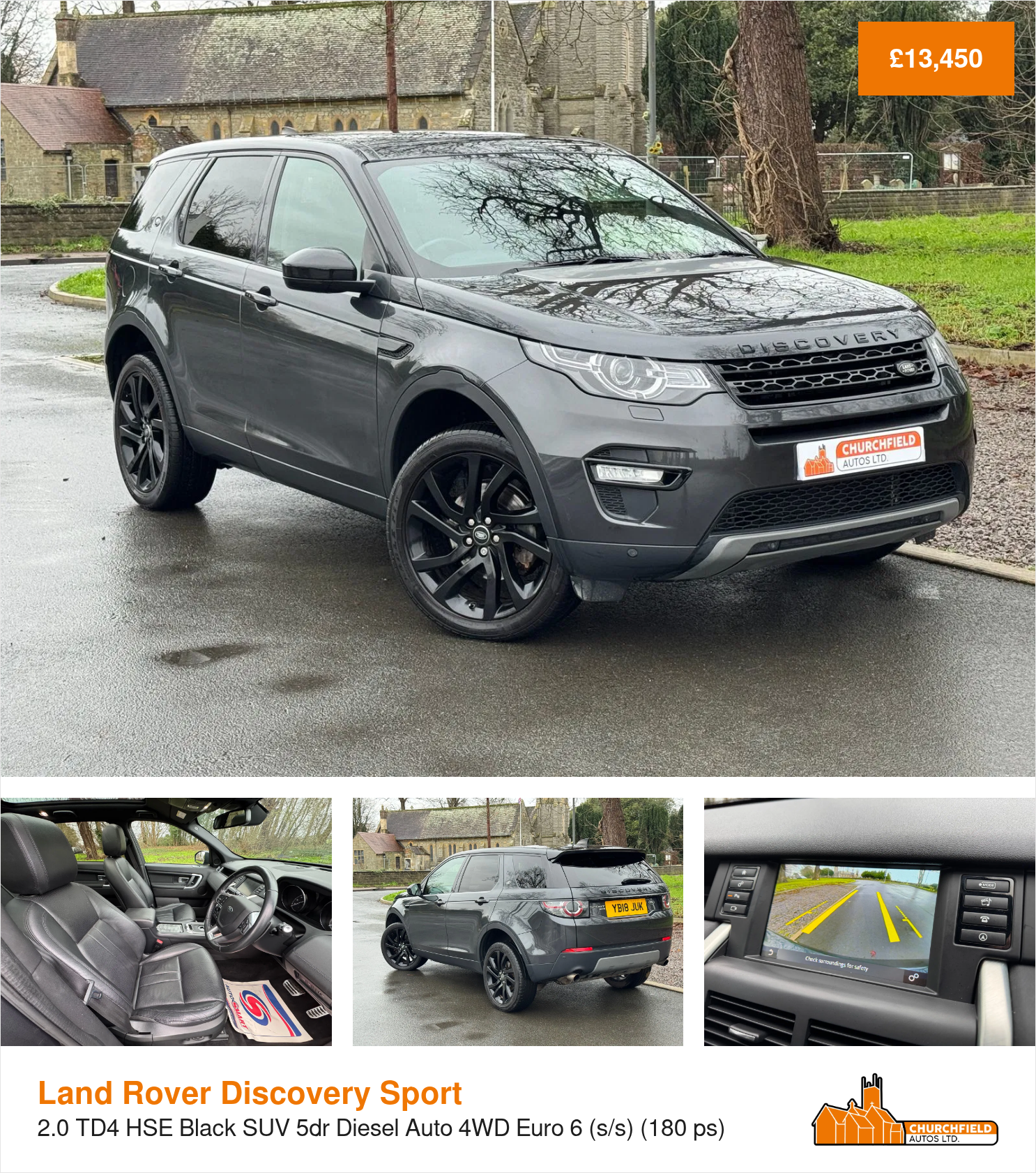 The Land Rover Discovery Sport is one seriously amazing car! Amazingly capable, thanks to its 4WD and clever all terrain driving systems, and amazingly practical, thanks to its huge boot, sliding seats and 7 seat layout. This specific example is very special in its own right, thank to its stunning styling - beautiful Carpathian Grey paintwork, complimented by HSE black pack styling which includes a contrasting black roof, black mirrors, privacy glass and a gorgeous set of 20" glass black alloys. This car drives absolutely flawlessly, thanks to its powerful 2.0 diesel engine which is coupled to a silky smooth 9 speed auto gearbox which delivers effortless performance, yet still remains fully ULEZ compliant and capable of 50+ MPG. The specification on this HSE Black model is insane! - keyless entry, panoramic fixed glass roof, power tailgate, heated seats, Meridian sound system, DAB, reversing camera, parking sensors, xenon LED headlights and the list just goes on! The car has a history comprising of 4 main dealer visits and a recent independent garage full service, plus will come supplied with a fresh 12 month advisory free MOT. All vehicles supplied by Churchfield Autos Ltd are fully mechanically inspected, history checked and come with 3 month comprehensive warranty. Flexible finance options and extended warranties are available, please ask for further information or visit our website for more information. Please contact us before coming to view to ensure we are on site and ready to help. If you have any questions or queries please do not hesitate to get in touch.
