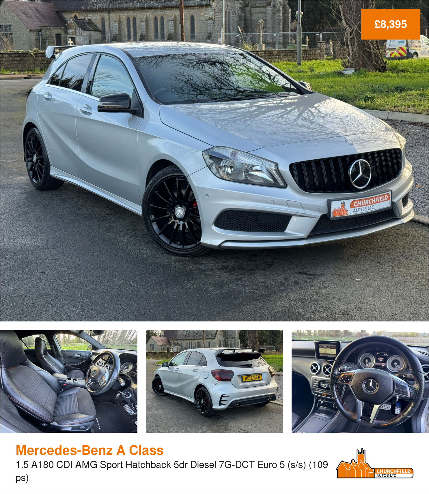 The Mercedes-Benz A class is an incredible mix of practicality, comfort, safety, efficiency and jaw dropping style! This particular example has the stunning AMG Line specification and features some additional styling features such as an AMG style rear spoiler, privacy glass, black mirrors, upgraded front grill and stunning 18" gloss black AMG alloy wheels - which when set against the classy silver metallic bodywork makes this a real head turner of a car! The inside features a stylish black half suede/leather design with red contrast stitching which really ties in well with the sporty look of the car and the specification of the vehicle includes SAT NAV, active park assist, Bluetooth, Isofix, auto lights, auto wipers, cruise control and more... This car has the super economical 1.5 diesel engine coupled with a silky smooth automatic gearbox which makes it an absolute breeze to drive, plus it's incredibly economical at just £35 a year to tax and capable of over 60+ MPG. This car has a part service history, but has just had 4 new tyres fitted and will benefit from a service before sale, in addition, it has a fresh MOT with no advisories whatsoever. the '12' reg private plate is included with the car, the actual registration is a 2014 '64' plate. All vehicles supplied by Churchfield Autos Ltd are fully mechanically inspected, history checked and come with 3 month comprehensive warranty. Flexible finance options and extended warranties are available, please ask for further information or visit our website for more information. Please contact us before coming to view to ensure we are on site and ready to help. If you have any questions or queries please do not hesitate to get in touch.