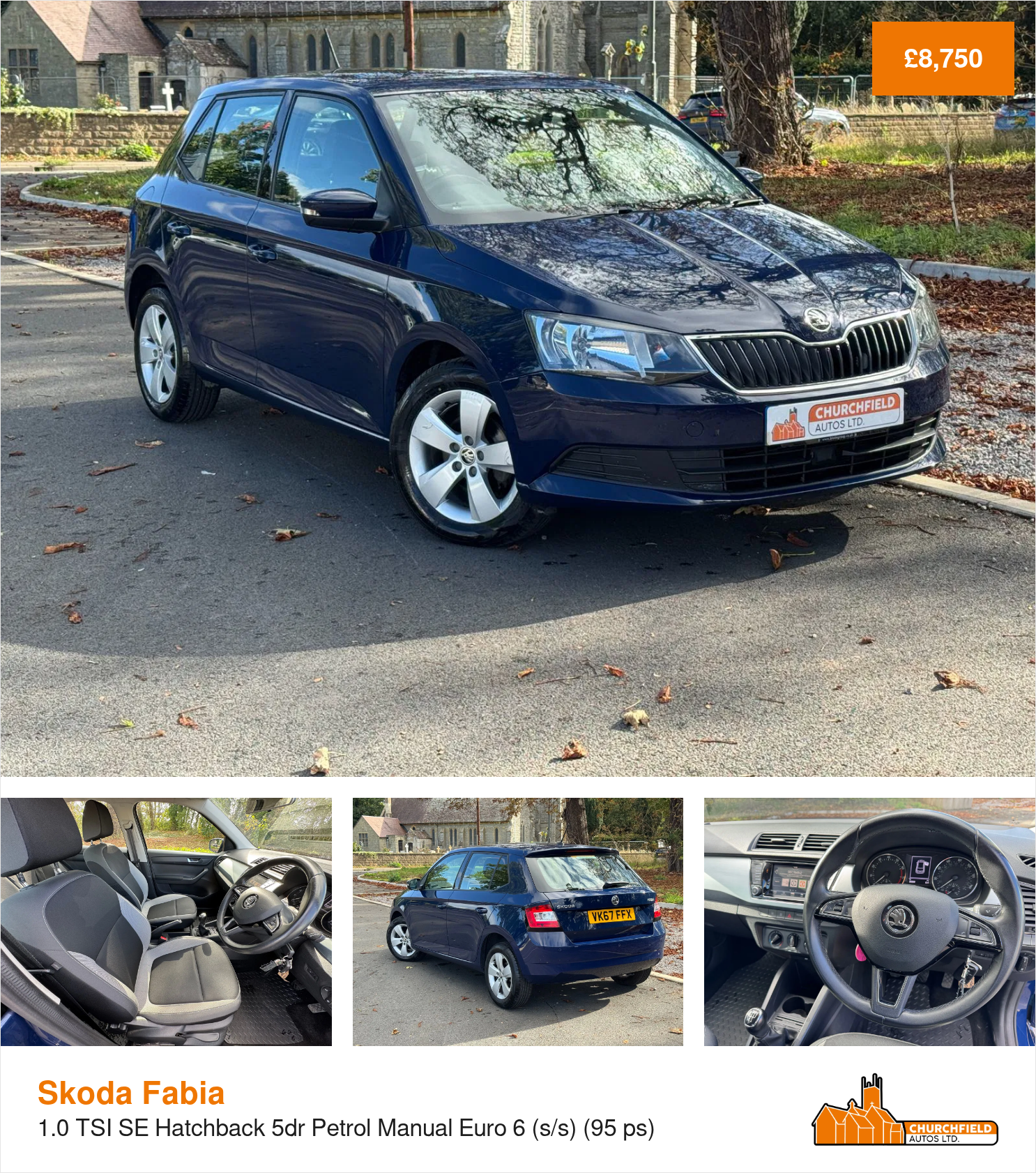 The Skoda Fabia is a fantastic, practical and easy to use everyday car! It's not too big, its not too small, it has great equipment and features and offers excellent practicality thanks to its 5 door layout, hatchback boot and folding rear seats. This low mileage example looks very classy in its Pacific Blue paintwork and has a very stylish black/onyx grey cloth upholstery - which is in superb condition throughout. This Fabia has the super efficient 1.0 litre petrol engine, which offers over 60+ MPG and is both ULEZ and Clean Air Zone compliant! The specification of the car is great, including DAB radio, Bluetooth, touch screen infotainment system, rear parking sensors, cruise control and much more... This car has just benefitted from two new front shocks, a full service, plus has a 12 month MOT with not advisories, so is set for many miles of low cost motoring for its new owner. All vehicles supplied by Churchfield Autos Ltd are fully mechanically inspected, history checked and come with 3 month comprehensive warranty. Flexible finance options and extended warranties are available, please ask for further information or visit our website for more information. Please contact us before coming to view to ensure we are on site and ready to help. If you have any questions or queries please do not hesitate to get in touch.