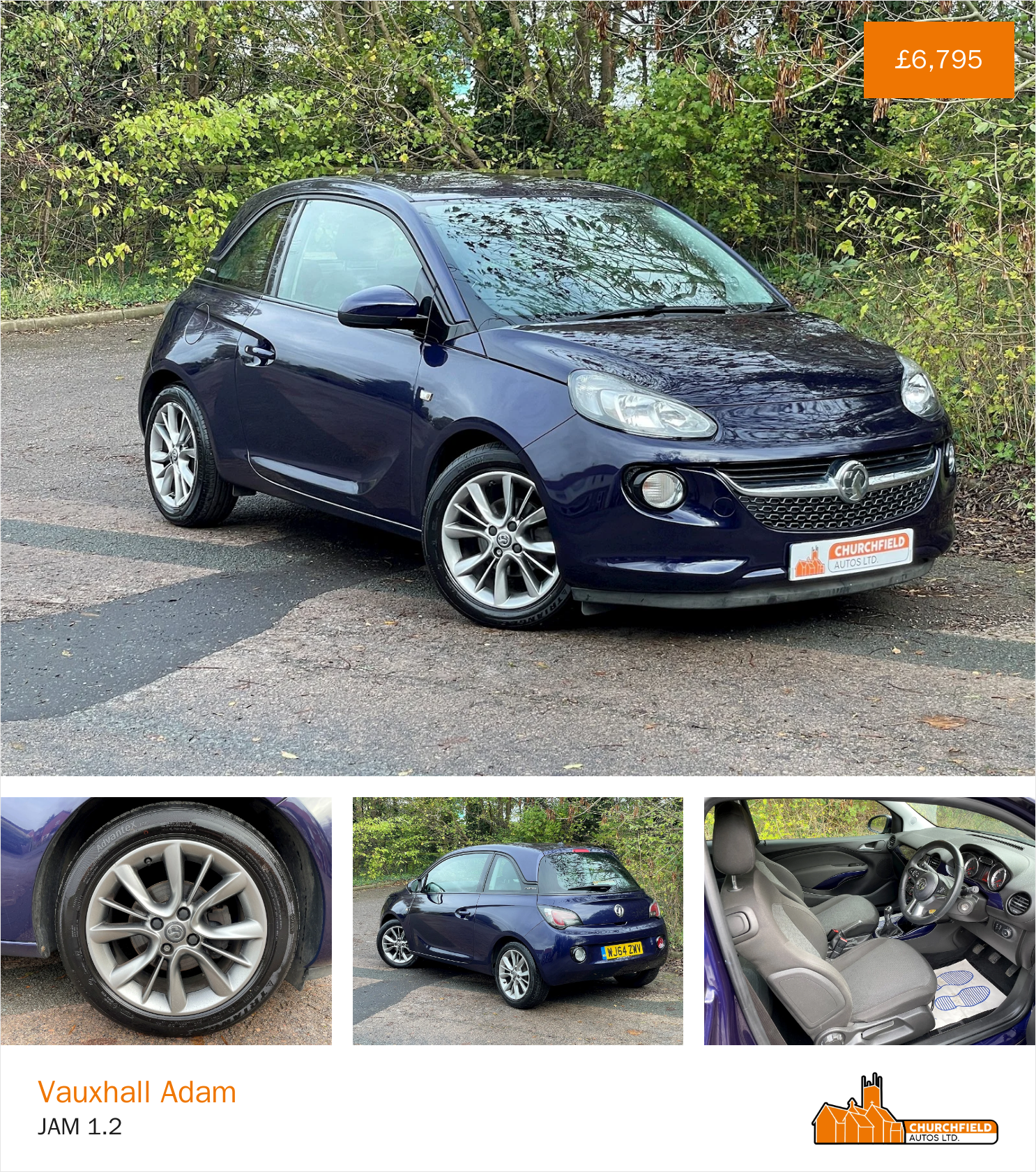 This Vauxhall Adam is a fantastically stylish compact hatchback car. It is powered by a nippy and economical 1.2 petrol engine and looks amazing in its dark blue (almost purple) metallic paintwork with 16" gunmetal grey alloy wheels! This stunning coloured paint extends to the interior of the car where its trim finishes are colour coded and look amazing against the immaculate conditioned grey upholstery. This car has covered just 37k miles from new and drives faultlessly, it really is a fun car to drive and is complimented by a range of excellent features such as DAB radio, ice cold air conditioning, Bluetooth phone, cruise control, isofix and much more! The car has an excellent service record and will be complimented by a fresh service and MOT before sale. All vehicles supplied by Churchfield Autos Ltd are fully mechanically inspected, history checked and come with 3 month comprehensive warranty. Flexible finance options and extended warranties are available, please ask for further information or visit our website for more information. Please contact us before coming to view to ensure we are on site and ready to help. If you have any questions or queries please do not hesitate to get in touch.