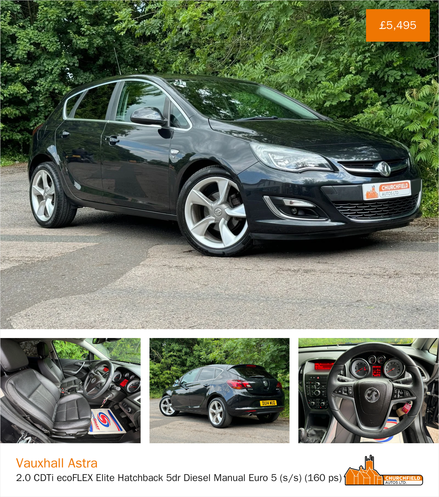 The Vauxhall Astra is a hugely popular car and when it comes in the Elite trim level, as this one does, it really is quite remarkable just how much car you get for your money - this really is prestige car specification for volume car money! The car offers good size and practicality with split folding rear seats, as looks fantastic in its black metallic bodywork, privacy glass and 19" 5 spoke alloy wheels. The inside of the car is awesome with its full black Leather upholstery and spec including heated seats, lumbar support, cruise control, auto lights/wipers, aux input, dual zone climate control and more... The 2.0 diesel engine drives superbly with no issues, it has superb power, yet remains very efficient at over 45 mpg and just £35 a year to tax!! This car has just had a full service carried out along with a full CAMBELT and WATER PUMP replacement done - this is a big ticket spend which is taken care of to ensure its next owner can enjoy many miles of hassle free motoring. All vehicles supplied by Churchfield Autos Ltd are fully mechanically inspected, history checked and come with 3 month comprehensive warranty. Flexible finance options and extended warranties are available, please ask for further information or visit our website for more information. Please contact us before coming to view to ensure we are on site and ready to help. If you have any questions or queries please do not hesitate to get in touch.